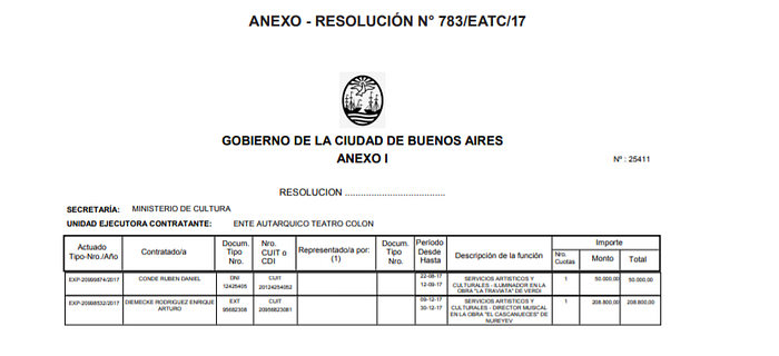 Caso más extraño el de Diego Armengol, supuestamente protegido por la gremialista de SUTECBA y proveedora del Colón Andrea Merenzón: Armengol ostentaría dos cargos públicos al mismo tiempo, estando a la vez en la Orquesta Sinfónica Nacional y en la Estable del teatro. Constitucionalmente, nadie puede acumular dos o más empleos o funciones públicas rentados.